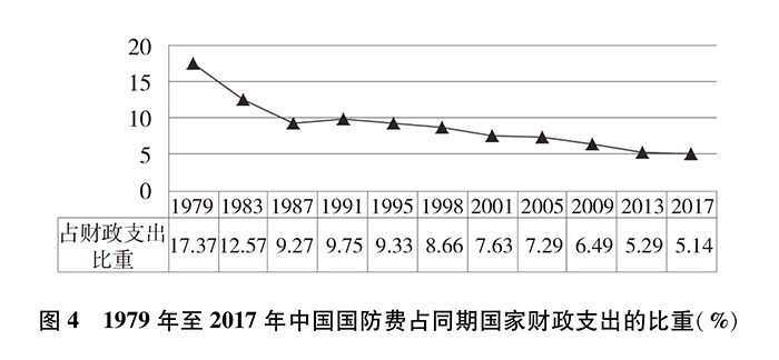 改革開放以來,中國國防開支經(jīng)歷了從維持性投入到適度增長的發(fā)展歷程,總體保持與國家經(jīng)濟和財政支出同步適度協(xié)調(diào)增長。國防費占國內(nèi)生產(chǎn)總值(GDP)比重從1979年最高的5.43%下降到2017年的1.26%,近30年一直保持在2%以內(nèi)。1979年國防費占國家財政支出比重為17.37%,2017年為5.14%,下降超過12個百分點,總體下降趨勢明顯。