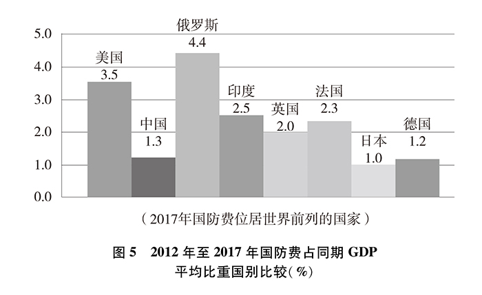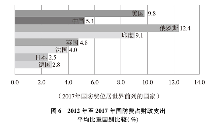 從國防費占財政支出比重看,2012年至2017年,中國國防費占財政支出平均比重約為5.3%,美國約為9.8%、俄羅斯約為12.4%、印度約為9.1%、英國約為4.8%、法國約為4.0%、日本約為2.5%、德國約為2.8%。中國國防費占財政支出的平均比重排在第四位。