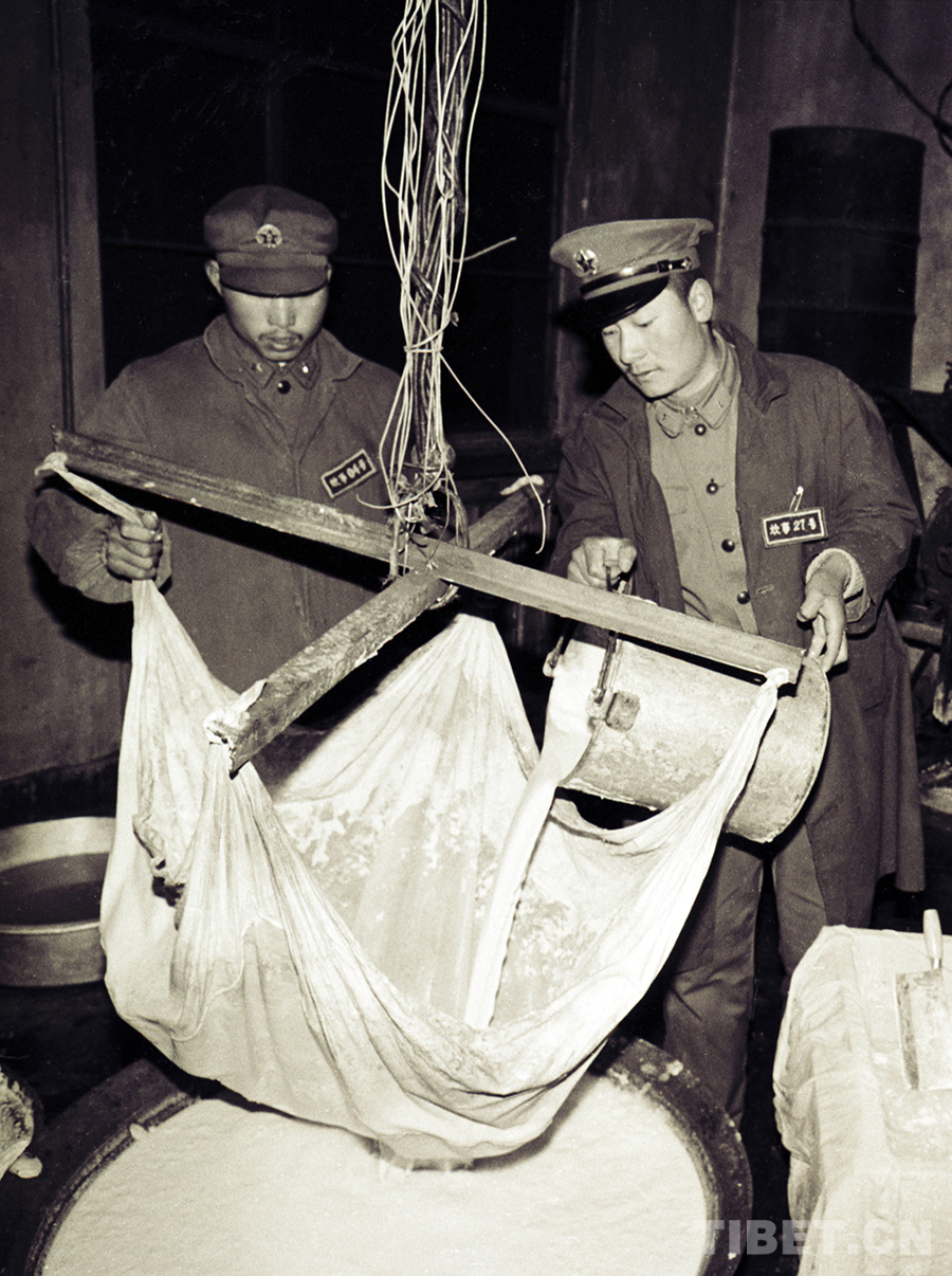 五道梁兵站戰(zhàn)士正在制作豆腐。在風(fēng)雪青藏公路線上,它豐富了過(guò)往人員就餐的“菜盤(pán)子”(唐召明1987年攝)