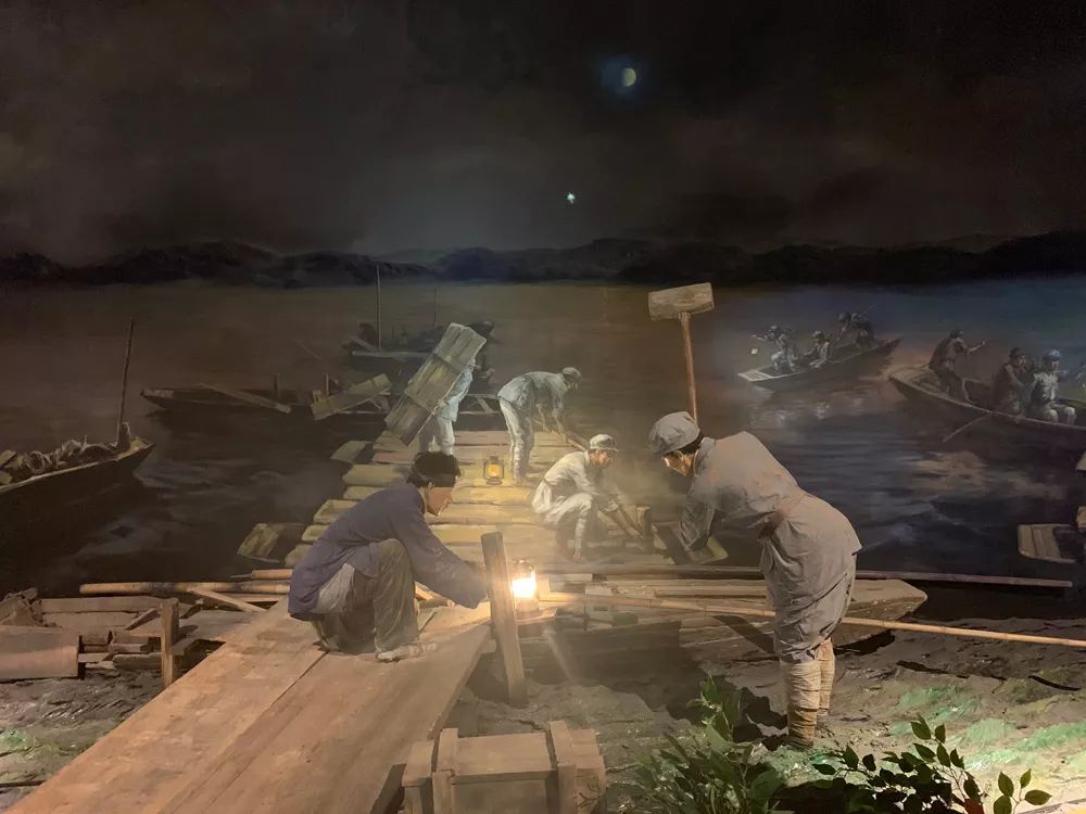中央紅軍長征出發(fā)紀(jì)念館中再現(xiàn)了軍民為避免敵機(jī)偵察被發(fā)現(xiàn),在夜間搭建浮橋的場景