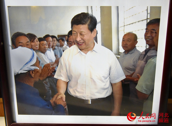 圖為2013年習(xí)近平總書(shū)記在平山縣西柏坡革命舊址同閆青海握手交談。(翻拍于閆青海家相框中照片。付兆颯 拍攝)