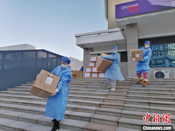 近日,武昌方艙醫(yī)院“管家”、武漢大學(xué)人民醫(yī)院對外聯(lián)絡(luò)部牽頭負(fù)責(zé)人沈嵐接受記者采訪。圖為沈嵐(左一)在方艙醫(yī)院搬運(yùn)物資。武大人民醫(yī)院供圖