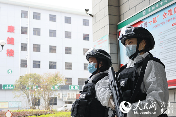 特警隊(duì)員熊吉平、孫思婕在襄陽(yáng)市中心醫(yī)院發(fā)熱門診外值守(襄陽(yáng)特警供圖)