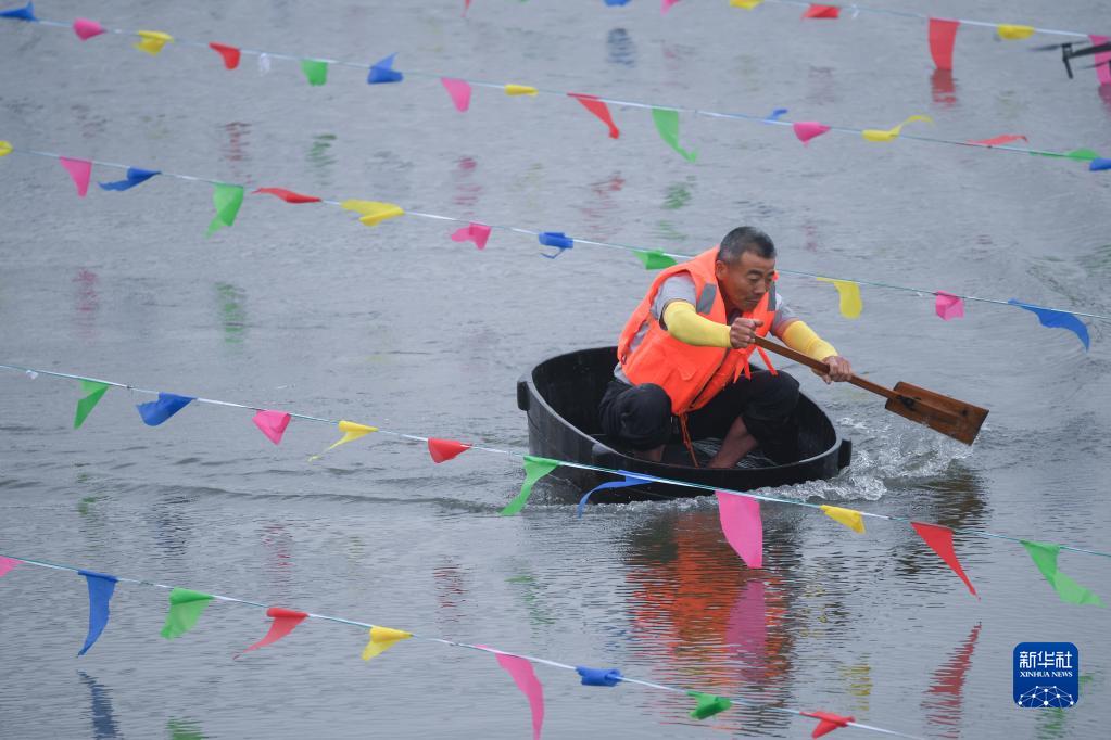 5月28日,在東林鎮(zhèn)保國(guó)村倪家灣港,村民參加“慶端午 劃菱桶”趣味比賽。新華社記者 徐昱 攝
