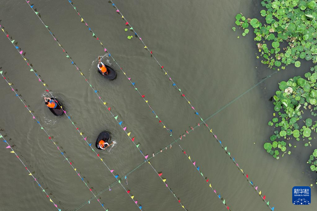 5月28日,在浙江省湖州市吳興區(qū),當(dāng)?shù)卮迕裨诤商羶?nèi)參加端午劃菱桶趣味活動(無人機(jī)照片)。新華社發(fā)(伊凡 攝)