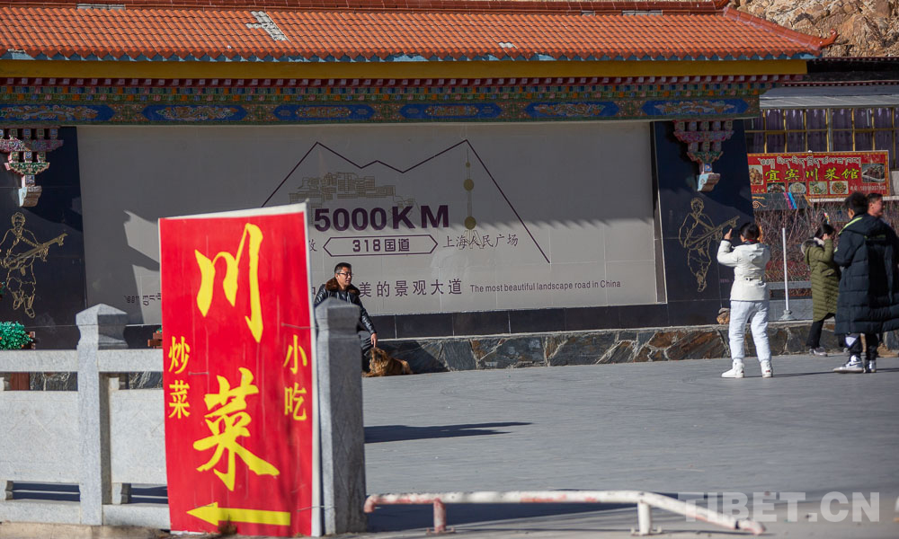 圖為“318國(guó)道5000KM里程碑”前指示餐館位置的指示牌 攝影:趙耀