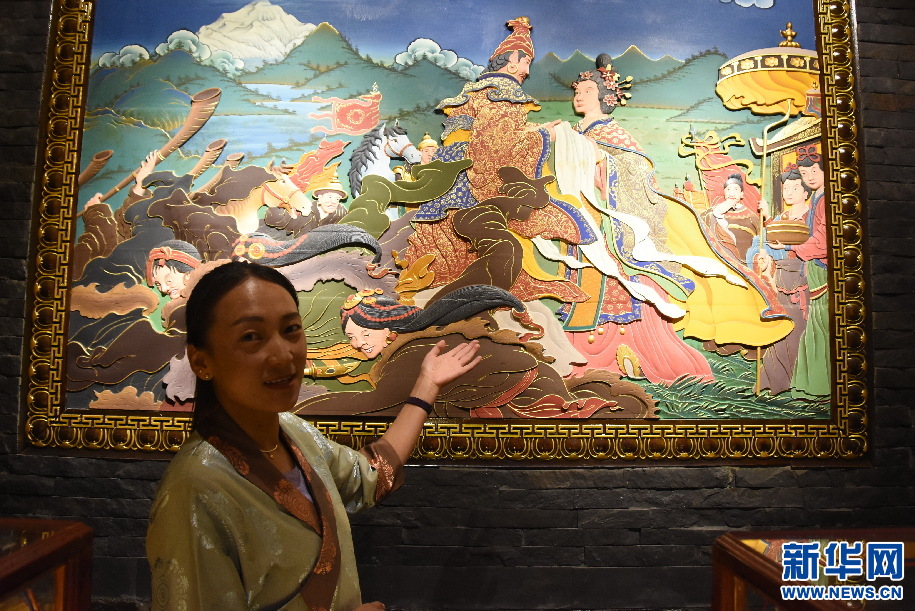 西藏日喀則康馬縣康諾瑪尼石實(shí)業(yè)有限公司講解員吳堅(jiān)拉姆在介紹反映文成公主和親的工藝品(9月16日攝)。新華網(wǎng) 張宸攝