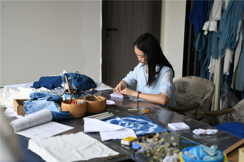 在四川省德陽市旌陽區(qū)高槐村扎染工作室,一名扎染愛好者在學(xué)習(xí)扎染技藝(6月14日攝)。新華社記者 王曦 攝