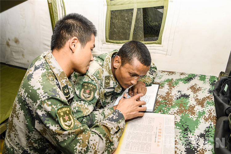 圖為戰(zhàn)友教巴桑寫漢字 攝影:王巍巍