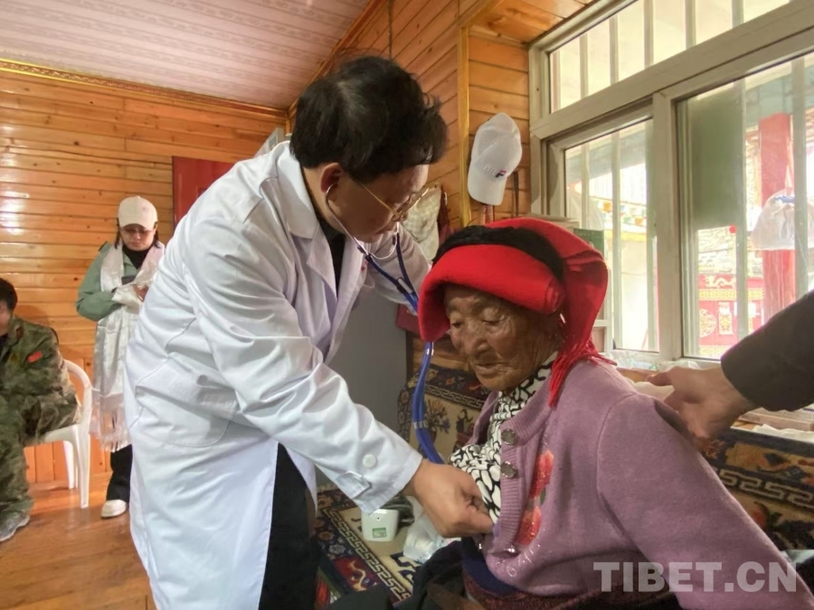 圖為“同心·共鑄中國心”醫(yī)務(wù)志愿者、廣東省中醫(yī)院心血管病??浦魅吾t(yī)師陳伯鈞為藏族阿媽查體