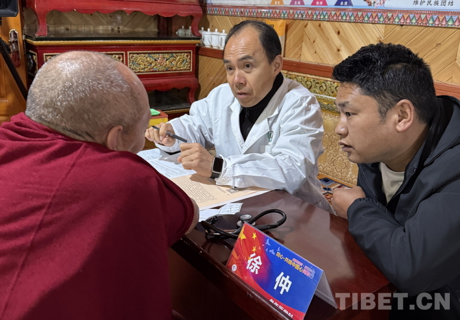 圖為醫(yī)療專家們在草登寺義診,廣州醫(yī)科大學附屬第三醫(yī)院老年醫(yī)學科主任、主任醫(yī)師徐仲正在與草登寺僧人溝通病情 攝影:喇應強