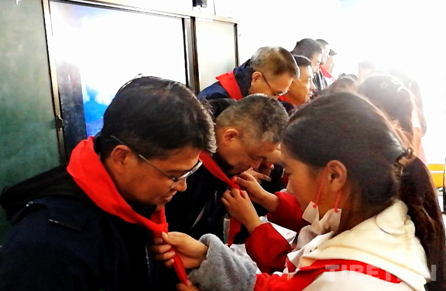 圖為四川省甘孜州石渠縣第二完全小學(xué)學(xué)生為醫(yī)療專家們獻(xiàn)上鮮艷的紅領(lǐng)巾 攝影:劉莉