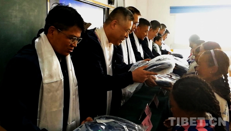 圖為醫(yī)療專家們向四川省甘孜州石渠縣第二完全小學(xué)學(xué)生贈(zèng)送學(xué)習(xí)用品 攝影:劉莉