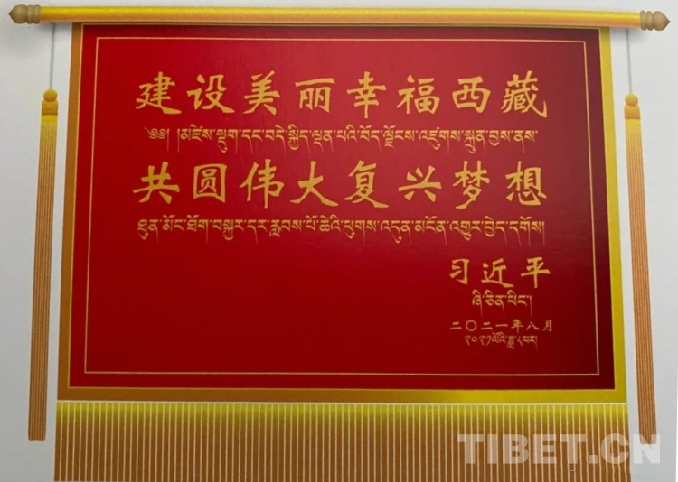習(xí)近平總書記題詞的“建設(shè)美麗幸福西藏 共圓偉大復(fù)興夢想”賀匾