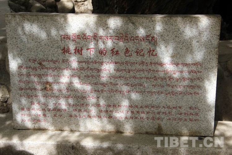 石碑用漢藏雙語刻就,題為“桃樹下的紅色記憶”,正文為“據(jù)考證,當(dāng)年18軍401團(tuán)的三營營房指揮部搭建在眼前的大桃樹下,部隊(duì)曾經(jīng)在此地了解民情,研究戰(zhàn)事。這棵樹見證了我軍維護(hù)地方穩(wěn)定,清剿悍匪的戰(zhàn)斗過程,至今每年3月當(dāng)?shù)厝罕姸紩?huì)自發(fā)前來撫今追昔,表達(dá)對(duì)先輩們的崇高敬意?!?/p>
