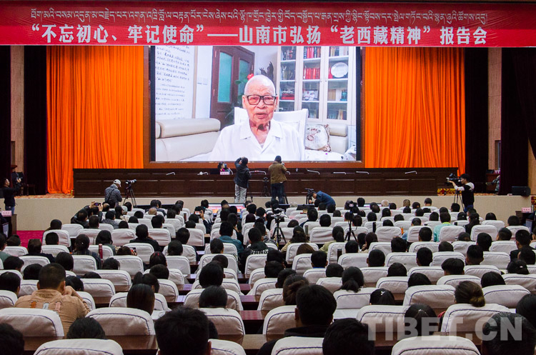 圖為報(bào)告會(huì)上,98歲高齡的西藏自治區(qū)黨委原第一書(shū)記陰法唐向活動(dòng)發(fā)來(lái)祝福視頻 攝影:趙耀