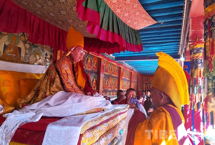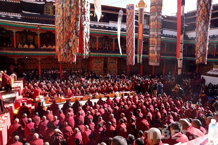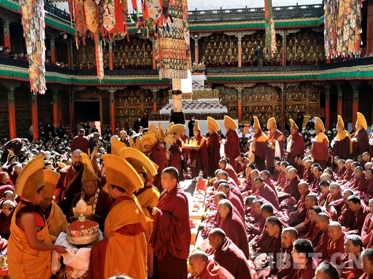上午10時,隨著法號響起,領(lǐng)經(jīng)師領(lǐng)經(jīng)下僧眾開始集體誦經(jīng),班禪由手持香爐和吹嗩吶僧人引路來到扎什倫布寺多加大院。慶祝儀式上,扎什倫布寺高僧活佛、各寺廟僧尼代表及班禪親屬依次敬獻(xiàn)曼扎、禮品。同時,扎什倫布寺僧人在會場上以辯經(jīng)、跳“卡爾”舞等方式祝賀,并向現(xiàn)場信教群眾發(fā)放酥油茶、人參果、八寶飯等,共沾法喜。場面恢宏,恭敬威儀。