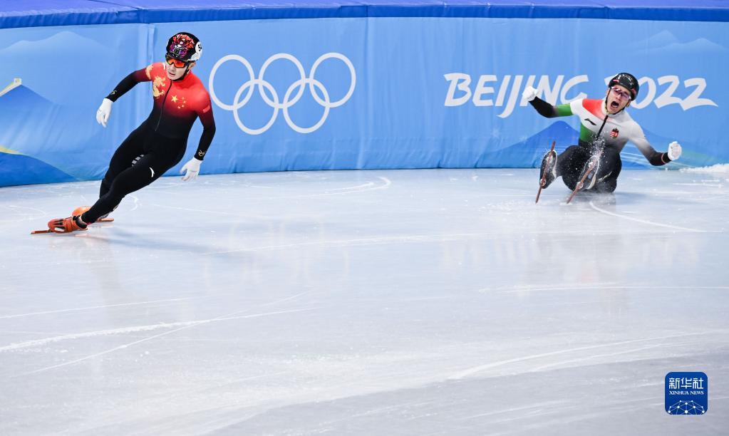 2月7日,中國選手任子威(上右)與匈牙利選手劉少林(上左)在比賽中。新華社記者 蘭紅光 攝