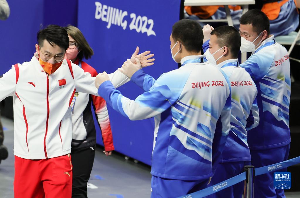 2月7日,中國隊在比賽后慶祝。新華社記者 徐子鑒 攝