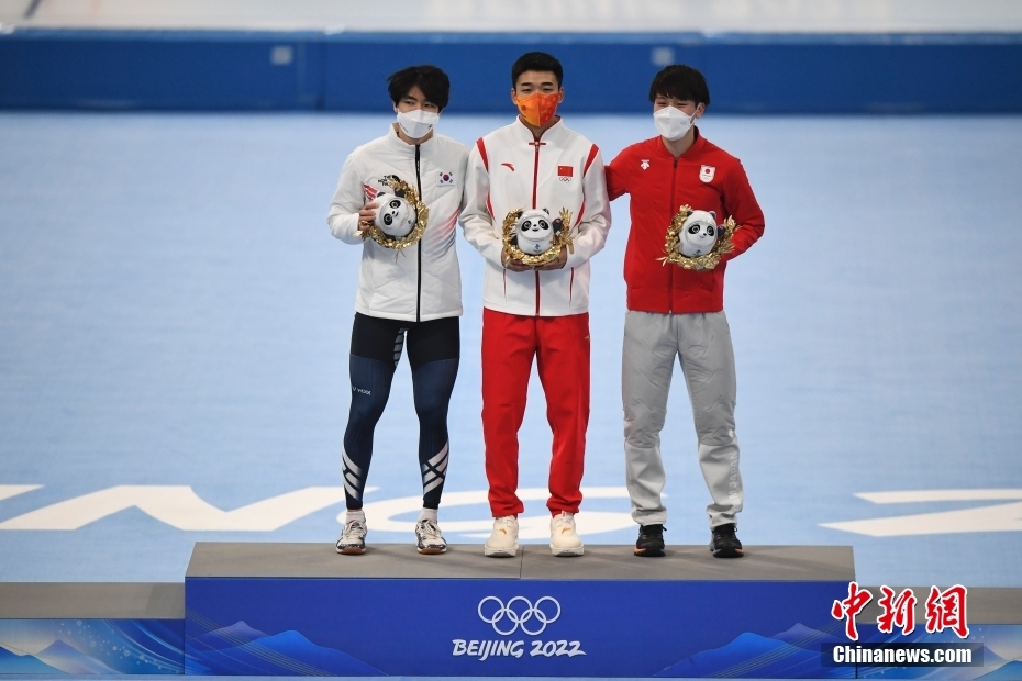 2月12日,北京2022年冬奧會(huì)速度滑冰男子500米決賽在國家速滑館“冰絲帶”舉行。中國選手高亭宇以34.32秒的成績打破奧運(yùn)會(huì)紀(jì)錄,奪得冠軍。這是中國首次在冬奧會(huì)速度滑冰男子項(xiàng)目獲得金牌。圖為高亭宇(中)在頒發(fā)紀(jì)念品儀式上。 中新社記者 李駿 攝