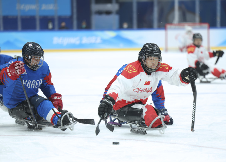 3月12日,中國隊球員申翼風(右)在北京冬殘奧會冰球銅牌賽中進攻。新華社記者蘭紅光攝