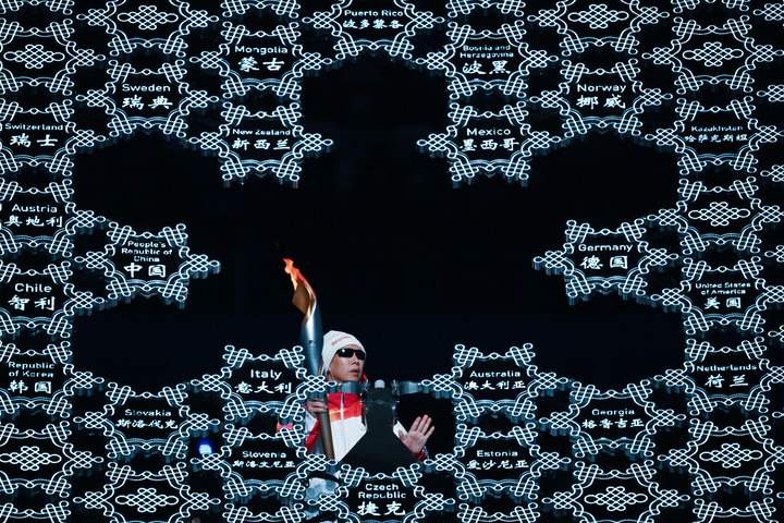 3月4日,最后一棒火炬手李端在北京2022年冬殘奧會開幕式上摸索火炬嵌入的位置。新華社記者李尕攝