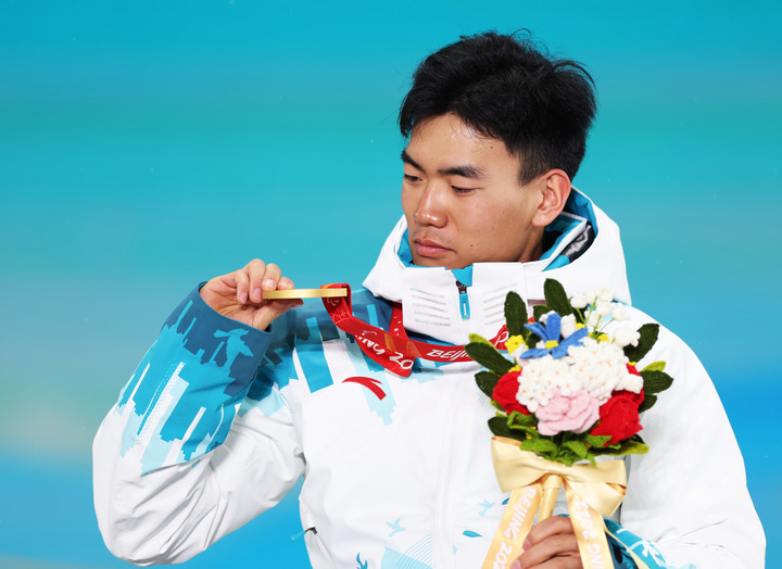 3月6日,冠軍中國選手劉子旭在北京冬殘奧會冬季兩項男子短距離(坐姿)獎牌頒發(fā)儀式上。新華社記者賈浩成攝