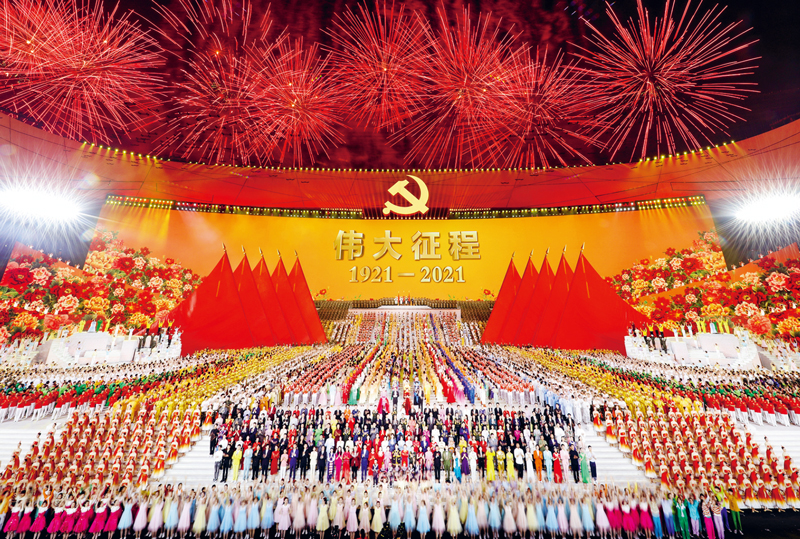 在百年奮斗歷程中,中國共產(chǎn)黨團結(jié)一切可以團結(jié)的力量、調(diào)動一切可以調(diào)動的積極因素,最大限度凝聚起共同奮斗的力量,推動著中國發(fā)展進步的歷史車輪滾滾向前。2021年6月28日晚,慶祝中國共產(chǎn)黨成立100周年文藝演出《偉大征程》在國家體育場盛大舉行。圖為文藝演出結(jié)束,全場共同高唱《沒有共產(chǎn)黨就沒有新中國》。 新華社記者 龐興雷/攝