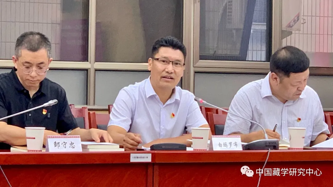 6月18日下午,中國(guó)藏學(xué)研究中心與西藏自治區(qū)在京掛職干部臨時(shí)黨支部舉行聯(lián)合主題黨日活動(dòng),學(xué)習(xí)貫徹習(xí)近平總書(shū)記在黨史學(xué)習(xí)教育動(dòng)員大會(huì)上的重要講話精神,學(xué)習(xí)《西藏和平解放與繁榮發(fā)展》白皮書(shū),并就加強(qiáng)合作交流,推動(dòng)藏學(xué)研究更好為西藏長(zhǎng)治久安和高質(zhì)量發(fā)展服務(wù),推進(jìn)藏研中心建設(shè)國(guó)家涉藏高端智庫(kù)進(jìn)行座談交流。藏研中心黨組成員、各科研業(yè)務(wù)部門負(fù)責(zé)人、科研業(yè)務(wù)辦公室全體人員和17位西藏自治區(qū)在京掛職干部參加活動(dòng)。座談?dòng)晌鞑卦诰炻毟刹颗R時(shí)黨支部書(shū)記、水利部建設(shè)司副司長(zhǎng)白瑪羅布主持,藏研中心黨組書(shū)記陳宗榮、總干事鄭堆出席活動(dòng)并講話。