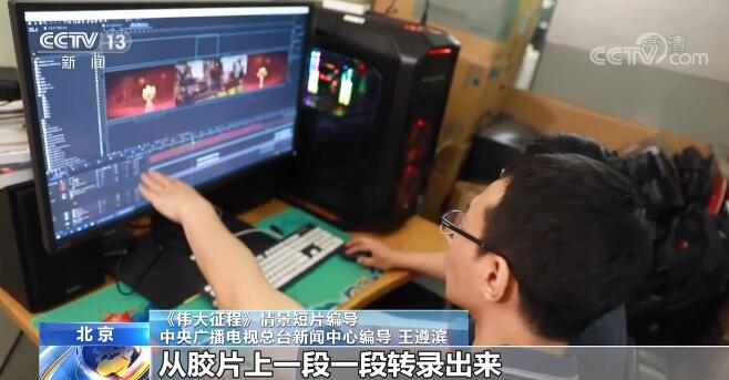 《偉大征程》情景短片編導 中央廣播電視總臺新聞中心編導 王遵濱:我們總臺的4K和8K的實驗室做了高質量修復,有一些畫面素材因為它存在一些物理性的這種損傷,我們就聯(lián)系了新影廠。然后他們根據我們成片里用到的鏡頭,選取他們庫里相應的內容,從膠片上一段一段轉錄出來,我們再進行節(jié)目的重新制作。