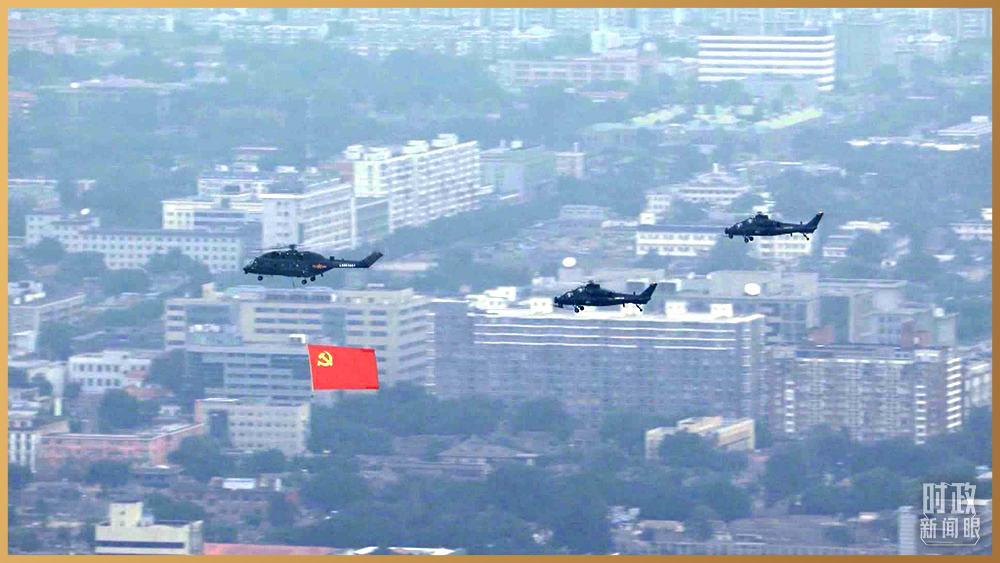 直升機懸掛鮮紅的中國共產黨黨旗飛過。
