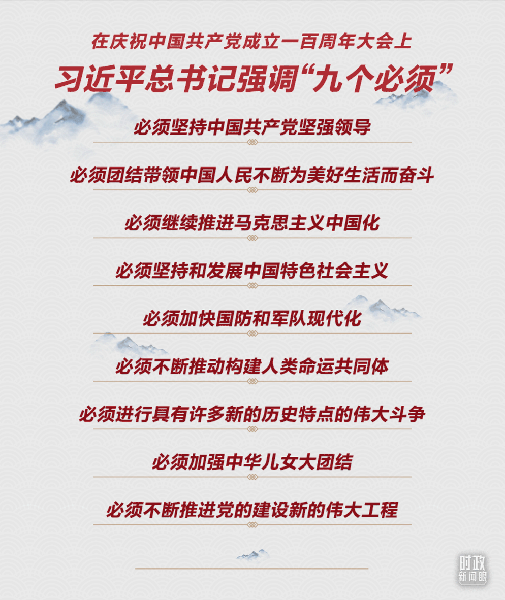 在7月1日的慶祝中國共產黨成立100周年大會上,習近平強調,我們要用歷史映照現實、遠觀未來,從中國共產黨的百年奮斗中看清楚過去我們?yōu)槭裁茨軌虺晒?、弄明白未來我們怎樣才能繼續(xù)成功。以史為鑒、開創(chuàng)未來,總書記提出“九個必須”,并作出許多新論斷、新表述。
