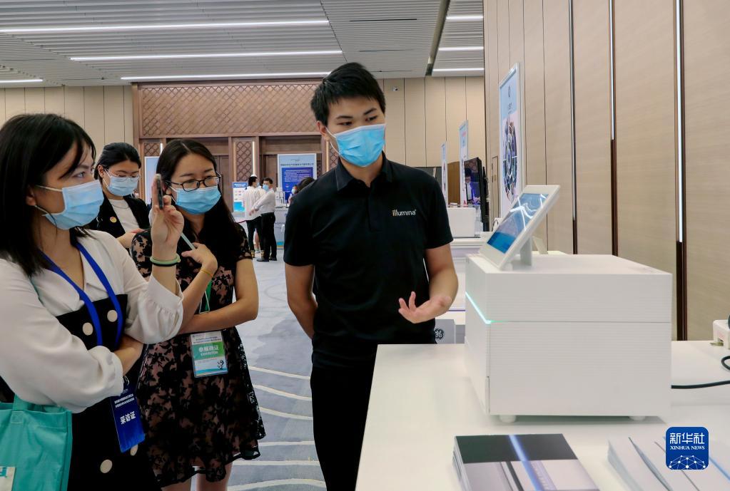 在國家會展中心(上海),第四屆進博會食品及農(nóng)產(chǎn)品展區(qū)、醫(yī)療器械及醫(yī)藥保健展區(qū)展前供需對接會的工作人員在介紹一臺測序儀展品(7月26日攝)。新華社記者 方喆 攝