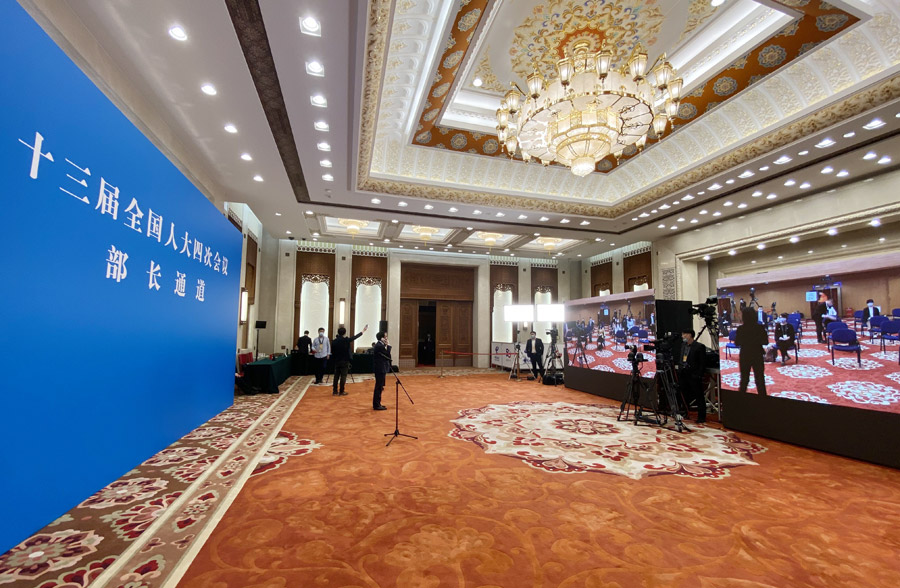 3月5日,十三屆全國(guó)人大四次會(huì)議開幕會(huì)結(jié)束后,舉行首場(chǎng)“部長(zhǎng)通道”采訪活動(dòng),邀請(qǐng)部分列席會(huì)議的國(guó)務(wù)院有關(guān)部委負(fù)責(zé)人通過網(wǎng)絡(luò)視頻方式接受采訪。圖為“部長(zhǎng)通道”現(xiàn)場(chǎng)。新華網(wǎng) 王翰林 攝
