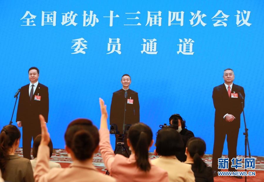 3月10日,全國(guó)政協(xié)十三屆四次會(huì)議在北京人民大會(huì)堂新聞發(fā)布廳舉行第三場(chǎng)“委員通道”采訪活動(dòng)。這是記者(屏幕中手持話筒者)通過(guò)網(wǎng)絡(luò)視頻方式提問(wèn)。新華社記者 王南 攝