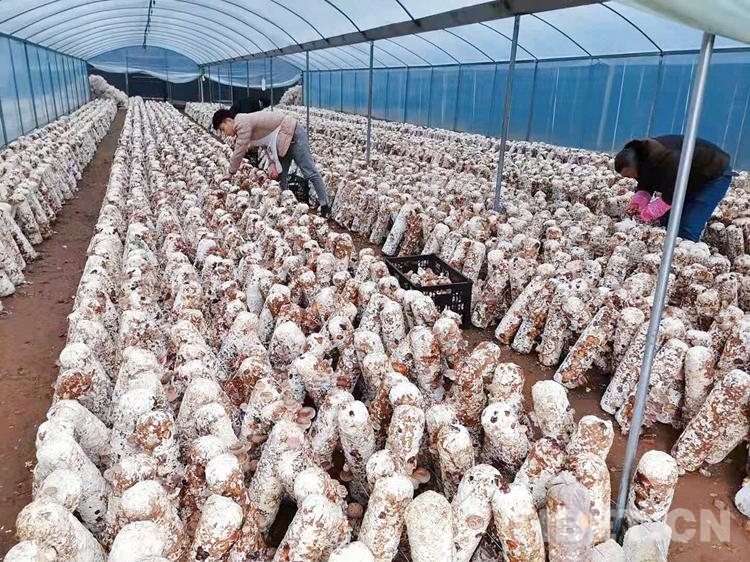 圖為農(nóng)民們在食用菌大棚內(nèi)勞作 圖片由社區(qū)黨支部提供