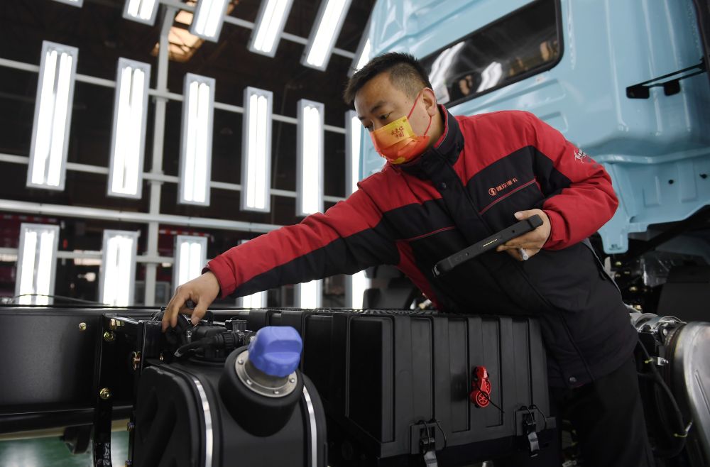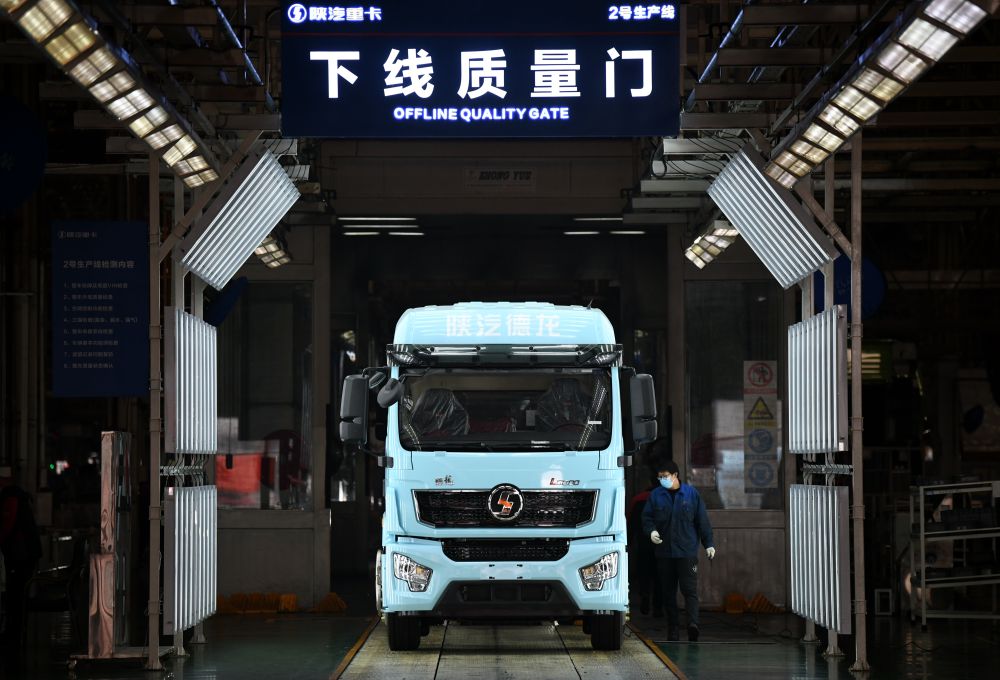 1月20日,工作人員在陜西汽車控股集團(tuán)有限公司總裝車間進(jìn)行重型卡車驗(yàn)收。