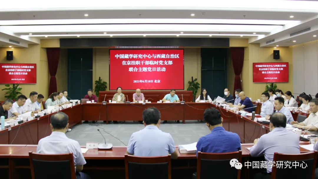 6月18日下午,中國藏學(xué)研究中心與西藏自治區(qū)在京掛職干部臨時(shí)黨支部舉行聯(lián)合主題黨日活動(dòng),學(xué)習(xí)貫徹習(xí)近平總書記在黨史學(xué)習(xí)教育動(dòng)員大會(huì)上的重要講話精神,學(xué)習(xí)《西藏和平解放與繁榮發(fā)展》白皮書,并就加強(qiáng)合作交流,推動(dòng)藏學(xué)研究更好為西藏長治久安和高質(zhì)量發(fā)展服務(wù),推進(jìn)藏研中心建設(shè)國家涉藏高端智庫進(jìn)行座談交流。藏研中心黨組成員、各科研業(yè)務(wù)部門負(fù)責(zé)人、科研業(yè)務(wù)辦公室全體人員和17位西藏自治區(qū)在京掛職干部參加活動(dòng)。座談?dòng)晌鞑卦诰炻毟刹颗R時(shí)黨支部書記、水利部建設(shè)司副司長白瑪羅布主持,藏研中心黨組書記陳宗榮、總干事鄭堆出席活動(dòng)并講話。