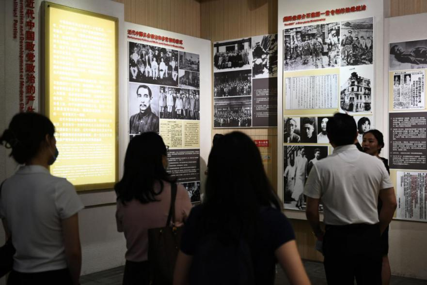6月21日,在位于重慶的中國民主黨派歷史陳列館內(nèi),工作人員向媒體記者講述近代中國政黨政治的產(chǎn)生過程。