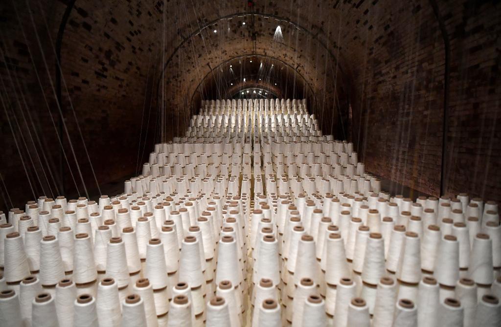 在陜西省寶雞市金臺(tái)區(qū)的長(zhǎng)樂塬抗戰(zhàn)工業(yè)遺址,其窯洞工廠最核心處有個(gè)“萬枚紗錠進(jìn)窯洞”的造型:上百枚紗錠為一組,線頭聚攏伸向窯洞頂端。