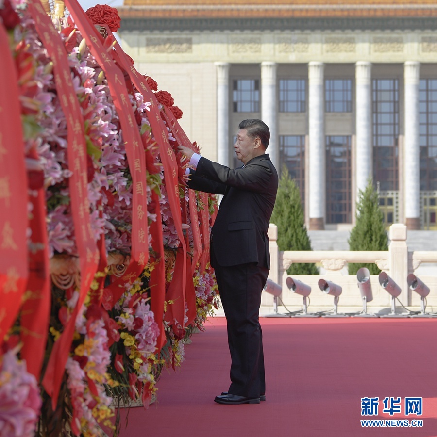 9月30日上午,黨和國家領(lǐng)導(dǎo)人習(xí)近平、李克強、栗戰(zhàn)書、汪洋、王滬寧、趙樂際、韓正、王岐山等來到北京天安門廣場,出席烈士紀(jì)念日向人民英雄敬獻花籃儀式。這是習(xí)近平整理花籃上的緞帶。 新華社記者 申宏 攝