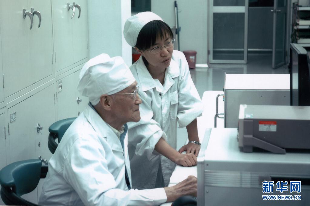 陸元九院士在航天時代電子公司激光陀螺實驗室與同事探討問題(2006年攝)。新華社發(fā)(中國航天科技集團供圖)