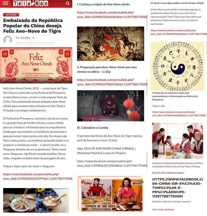 春節(jié)前夕,中國駐圣多美和普林西比使館在當?shù)刂饕T戶網(wǎng)站特拉儂網(wǎng)(Téla Nón)設(shè)立虎年春節(jié)專欄,向廣大旅圣普僑胞、中資機構(gòu)和留學(xué)生以及圣普人民送上新春祝福,并介紹中國春節(jié)習(xí)俗趣事,掀起迎接中國新年的熱潮。
