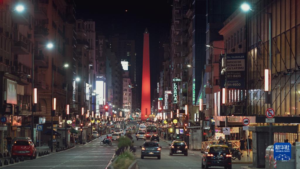 這是1月31日在阿根廷首都布宜諾斯艾利斯拍攝的亮起“中國紅”的方尖碑。新華社發(fā)(第四屆“中國春節(jié)文化之旅”主辦方供圖)