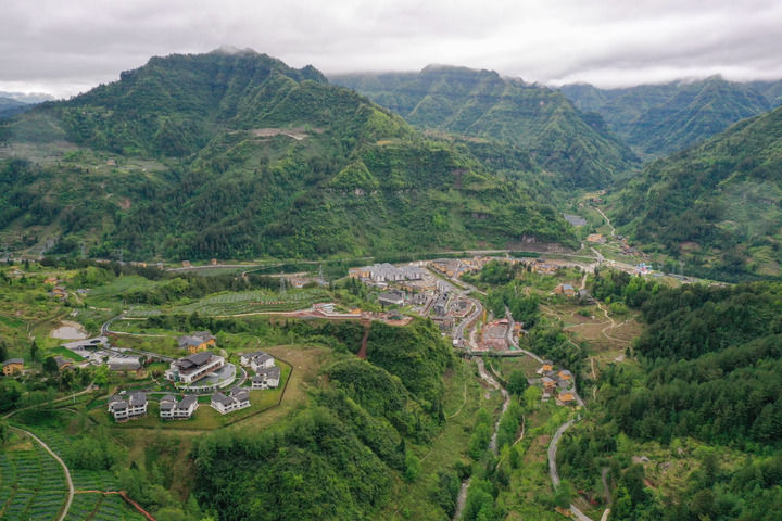 這是重慶石柱土家族自治縣中益鄉(xiāng)華溪村景觀(2022年4月14日攝,無人機(jī)照片)。新華社記者 唐奕 攝