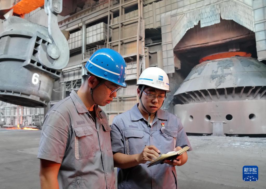 邯寶煉鋼廠特檔技術(shù)主管、轉(zhuǎn)爐車間副主任唐笑宇(右)在轉(zhuǎn)爐車間與工友交流(2022年9月7日攝)。新華社記者 楊世堯 攝