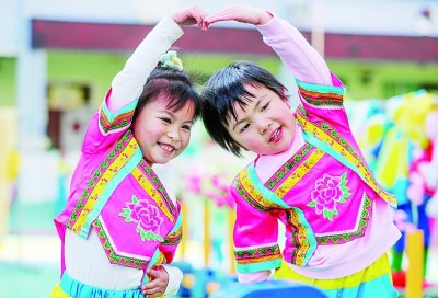 貴州省銅仁市玉屏侗族自治縣實(shí)驗(yàn)幼兒園的小朋友在進(jìn)行“時(shí)裝”走秀。胡攀學(xué)攝/光明圖片