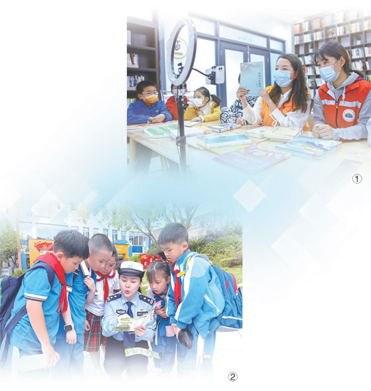 圖①:江蘇省如皋市如城街道聯合愛行動實踐中心,走進當地顧莊社區(qū)農家書屋,通過“線上+線下”方式開展“愛閱護苗”主題公益課堂活動。圖為志愿者通過網絡平臺為學生推薦好書。