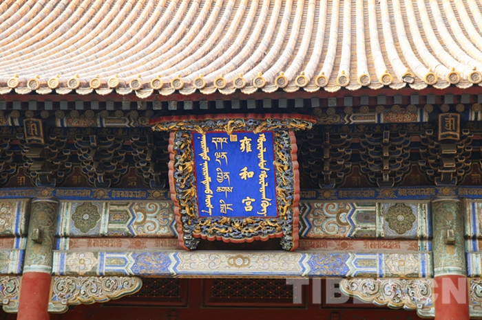圖為雍和宮大殿匾額,從右至左,以滿文、漢文、藏文、蒙古文書(shū)寫“雍和宮” 攝影:李元梅