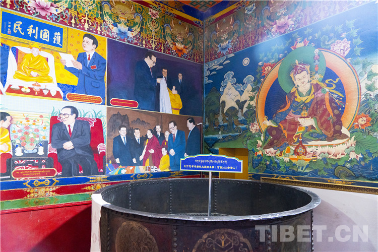 與寺廟內(nèi)傳統(tǒng)的佛教題材壁畫(huà)不同,在什倫布寺民族團(tuán)結(jié)和愛(ài)國(guó)主義教育基地展廳北側(cè),繪制著十世班禪額爾德尼·確吉堅(jiān)贊與歷代黨和國(guó)家領(lǐng)導(dǎo)人重要的會(huì)面時(shí)刻以及十一世班禪額爾德尼·確吉杰布金瓶掣簽的整個(gè)過(guò)程。